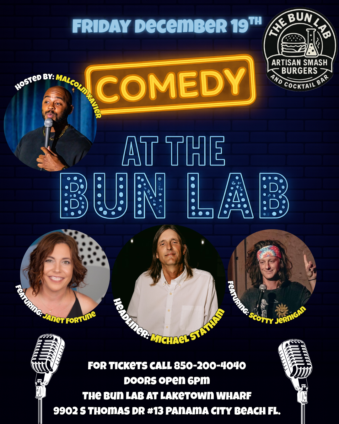 Join us at the Bun Lab On December 19th for the Best Comedy Nigth in Panama City Beach. You can purchase your advance tickets using the QR Code Below!